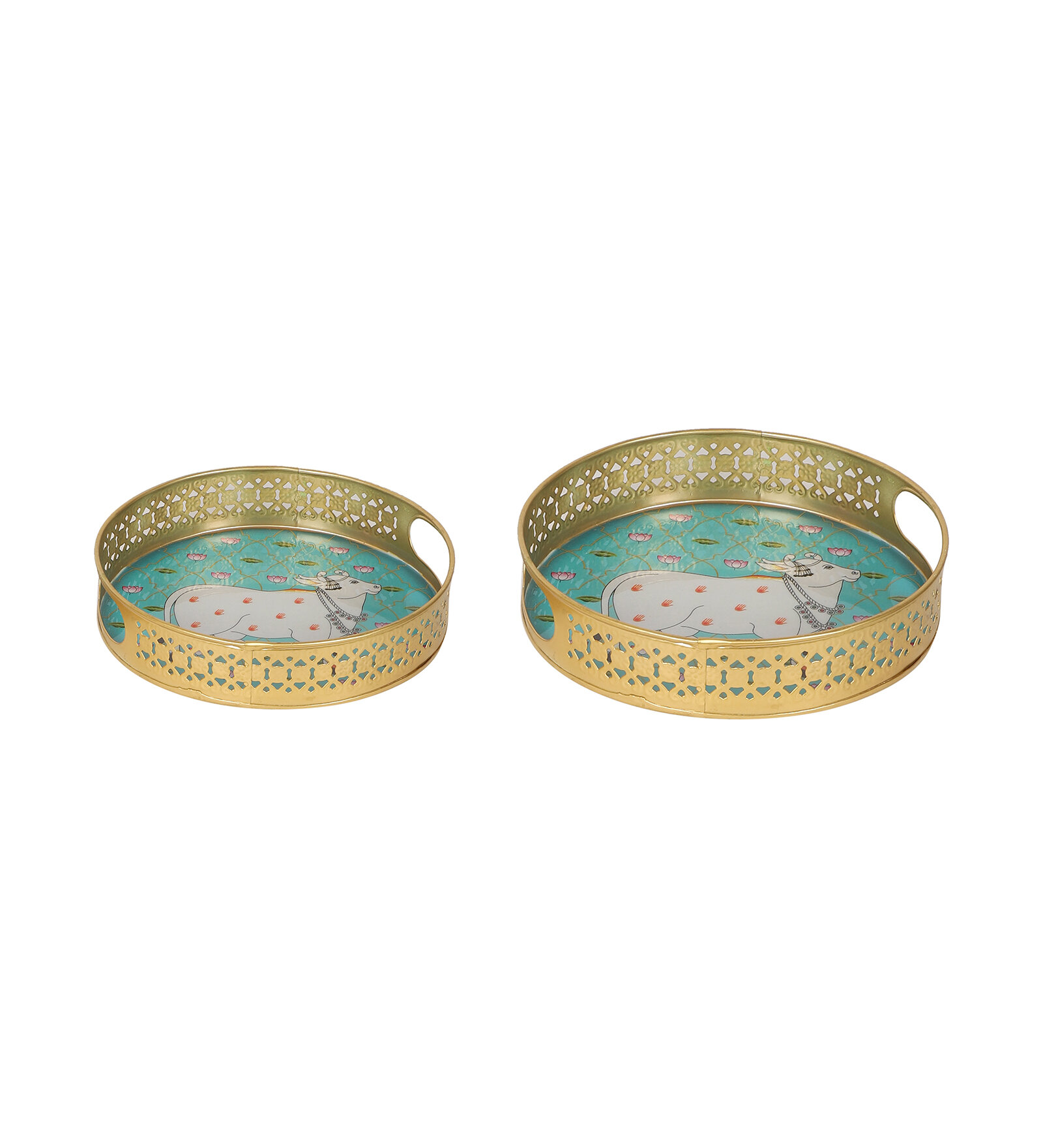 A Round Green Pichwai Tray Set of 2 is Perfect to Serve your Guest this festive season , it can be used to gift your loved ones