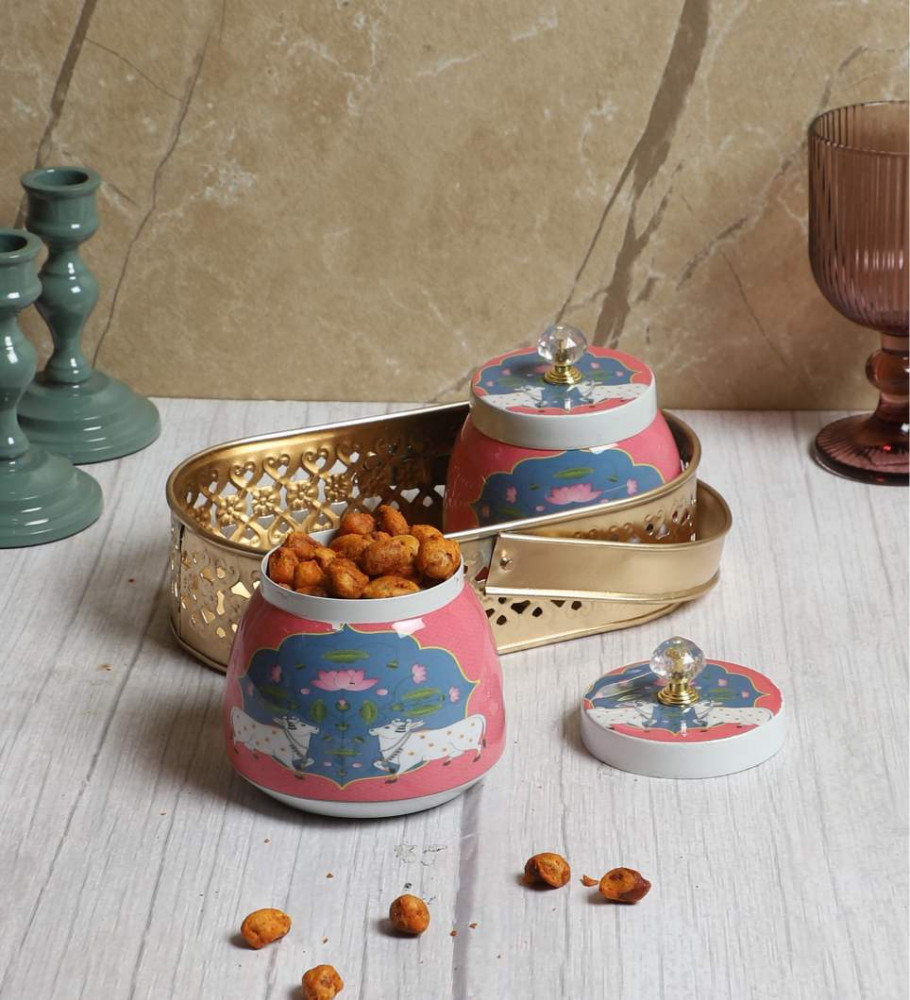 A White Cow Print Jars WIth basket Set of 2 is Perfect to Serve your Guest this festive season , it can be used to gift your loved ones